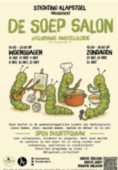 Elke woensdag & zondag kun je bij 'de buren' aanschuiven in de Soep Salon! Je ontmoet elkaar in het Clubhuis van Amstelglorie en gaat samen koken, eten, muziek maken, spelen en delen.